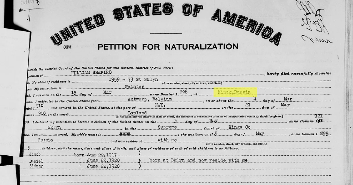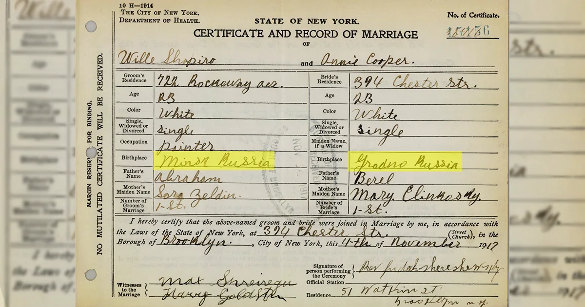 Менавіта ў пасведчанні аб шлюбе можна знайсці дадзеныя, адкуль паходзяць продкі псіхалагіні Фрэнсін Шапіры. Уільям Шапіра нарадзіўся ў 1896 годзе ў Мінску, а Анна ў 1895 годзе ў Гродне.